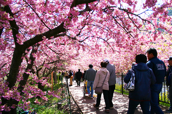 早咲きで有名な河津桜は花が大きくあざやかなピンク色で長期間楽しめるのが最大の特徴です。たくさんの屋台でお祭り気分も満喫。8,000本の桜と菜の花の競演で一足早い春をお楽しみください。